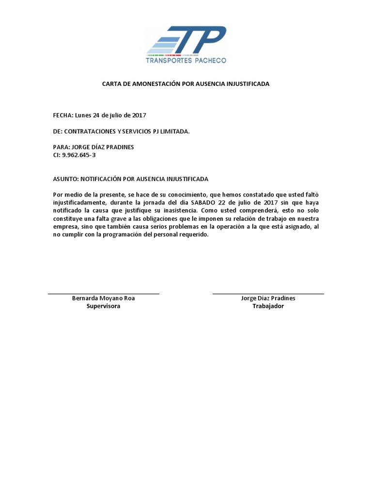 Carta De Amonestación Por Ausencia Injustificada via www.scribd.com
